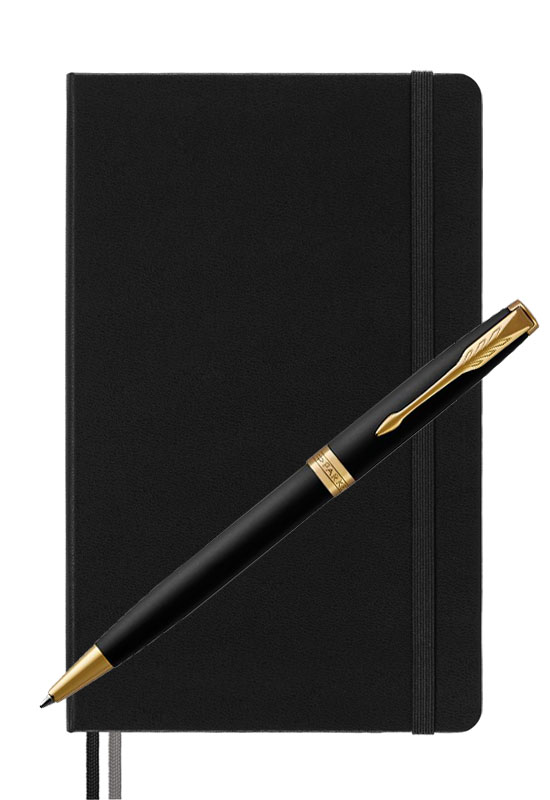 Parker Sonnet Matte Black Gt Moleskine от официального дилера Parker в Сергиевом Посаде. Вы можете дополнительно заказать гравировку, которая подчеркнет Вашу оригинальность и придаст памятность статусному подарку. Все ручки Паркер поставляются в фирменном футляре.